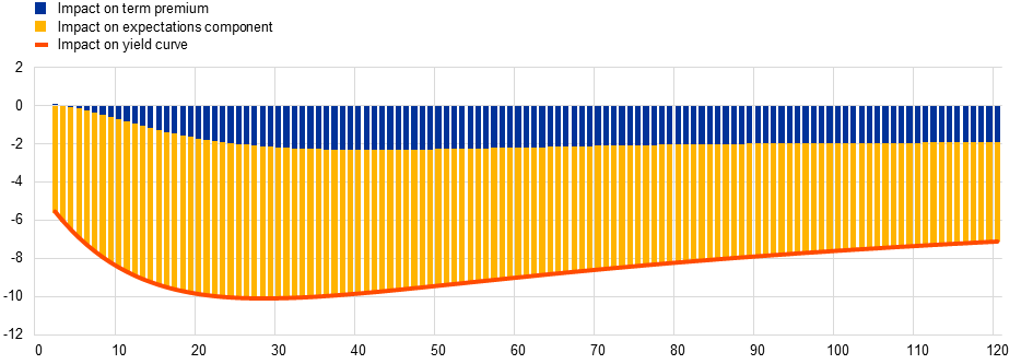 Notes: The chart depicts the instantaneous impact of a conventional monetary policy surprise on the yield curve and its components. The policy surprise is identified through high-frequency changes in the common component of a set of euro area short-term interest rates of maturities up to one year. The surprise (normalised so that the one-month rate is reduced by 10 basis points) thus captures effects beyond a pure target rate surprise. These effects may be interpreted as a signalling element of conventional monetary policy. The impact is computed on the basis of a shadow-rate term structure model following Geiger and Schupp (2018). Estimates are based on a sample ending in June 2014 in order to avoid interference with the period of negative policy rates and asset purchases.