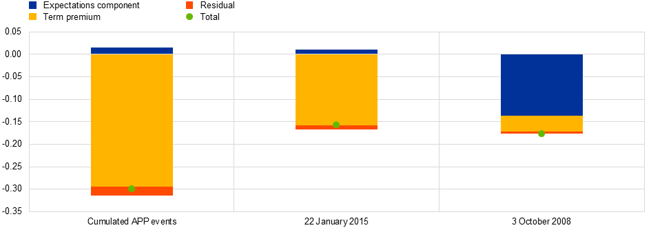Notes: Based on an affine term structure model, the bars shows the decomposed change of the ten-year Bund yield over the indicated horizons: left bar corresponds to cumulated one-day changes associated with APP-related ECB communication between summer 2014 and 22 January 2015. The other two bars correspond to a one-day change for the indicated date.