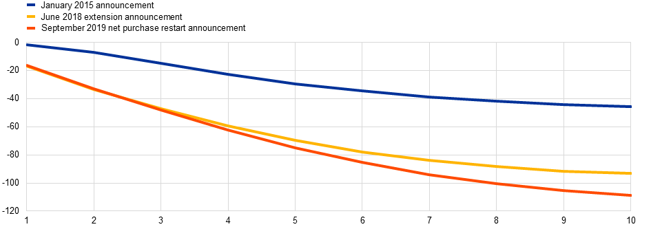 Notes: The figure shows by how much the term premium component of euro area sovereign yields (weighted average of Germany, France, Italy and Spain) with maturities of one to ten years is estimated to be compressed due to the APP through the duration channel at three dates: the announcement of the APP (Jan 2015), the extension of the programme in June 2018, and the announcement of the restart of net purchases in September 2019.