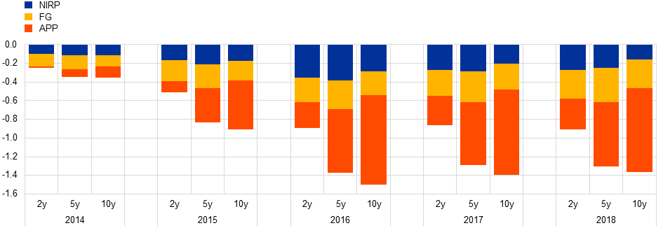 Notes: The chart illustrates the contribution of individual measures. The results are based on a Bayesian vector auto-regression. The impact of NIRP (negative interest rate policy) and FG (forward guidance) on sovereign yields works via the short-term rate and the OIS forward curve, and the impact of the APP operates via term premia.