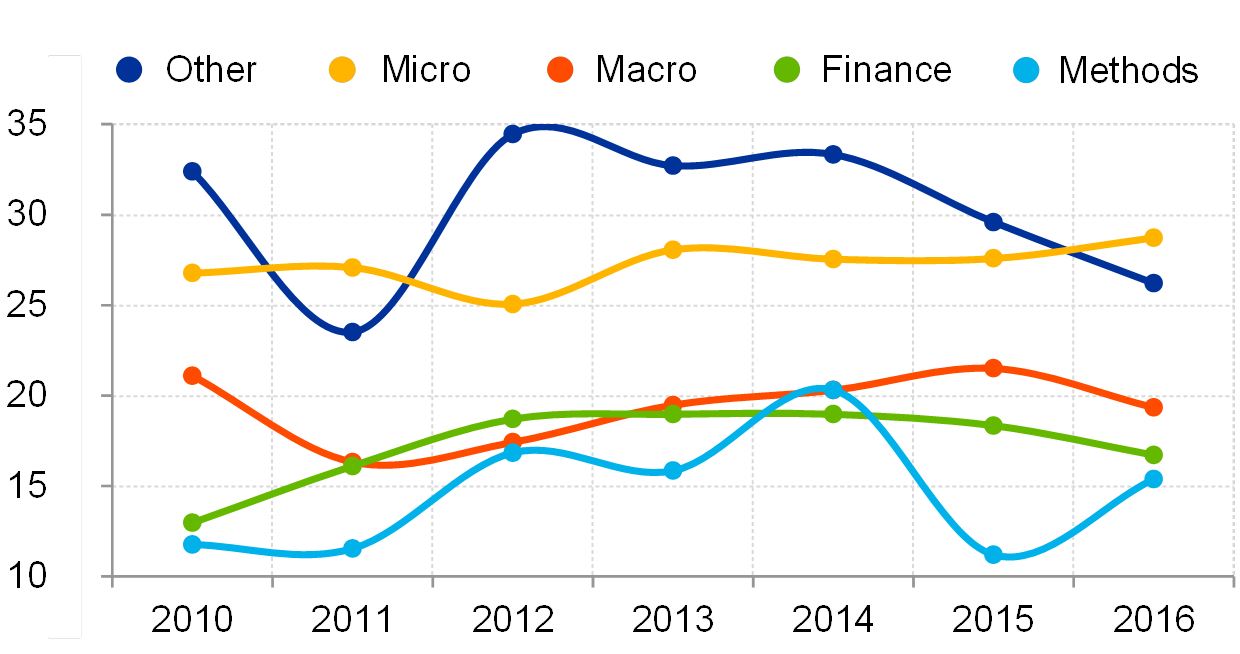 Note: The analysis uses data based on the programs of the annual meetings of the American Economic Association between 2010 and 2016. The data set includes the JEL codes of individual sessions as well as the names of the authors. Based on the JEL codes, individual papers are classified into five sub-fields: Microeconomics (including both theoretical and empirical micro-oriented topics); Macroeconomics (including international economics); Finance; Methods (mathematical and quantitative methods) and Other (a set of miscellaneous paper categories that do not fall into any of the other sub-fields). The names of the authors are classified by gender using first-names databases.