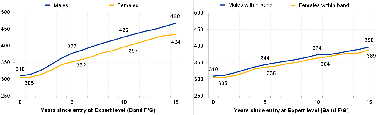 Note: The panel on the left-hand side shows the average salary step levels by gender since entry at Expert level (Band F/G) for all ECB employees included in the sample. The panel on the right-hand side illustrates the average salary step levels by gender since entry at Expert level (Band F/G) for those employees who remain at Expert level.