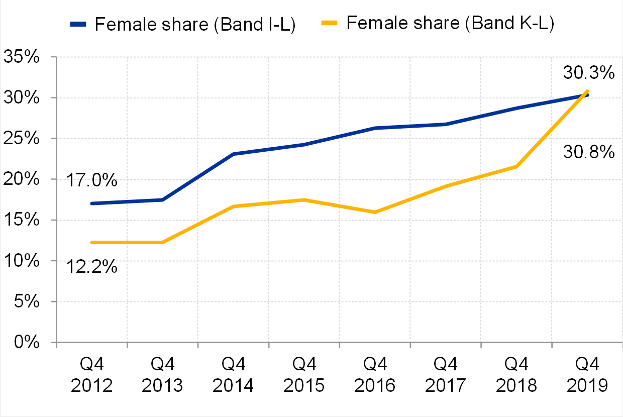As a result of the diversity and gender initiatives announced between 2010 and 2013, the ECB has made notable, but incomplete, progress in redressing its gender imbalance. At the end of 2019, women accounted for around 30% of all management positions (Band I-L) and 31% of senior management positions (Band K-L), up from 17% and 12% at the end of 2012, respectively (Figure 6).