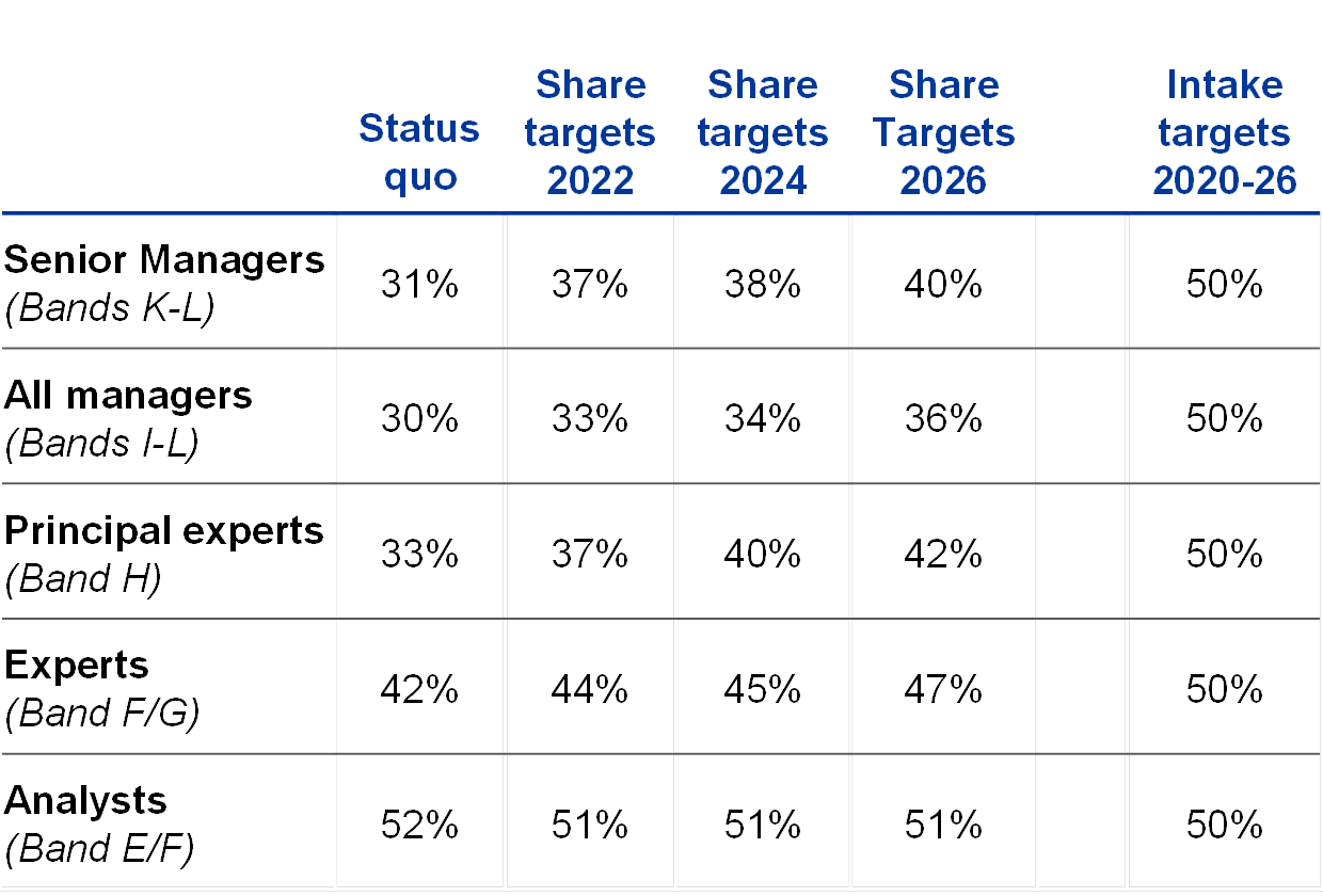 In line with these objectives, the ECB has recently overhauled its policy for internal promotions and appointments, including a revised set of gender targets for the period 2020-2026. Crucially, these gender targets now also include intake targets (Table 1). Our rules foresee that each selection committee for managerial recruitment campaigns includes at least two women. Under the new framework, senior managers are held accountable for ensuring that their business areas are on track to meet their individual targets.