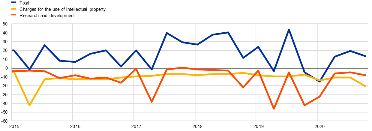 Over time, the location of corporate structures has become increasingly mobile. This has been partly driven by fiscal and regulatory arbitrage incentives that motivate the re-domiciliation of headquarters and the geographical optimisation of the legal registration of intangible assets such as patents and copyrights. Intellectual property products (IPPs) have a high degree of cross-border fungibility and are of central importance not only for digital companies but also for other industries, such as pharmaceuticals. IPP-related transactions, which primarily reflect the operations of a small number of large companies, have had a marked effect on the services component of the euro area current account balance and were also visible – especially before the pandemic – in the euro area national accounts, where these appear as high imports of services and gross fixed capital formation (Charts 1 and 2).[4]