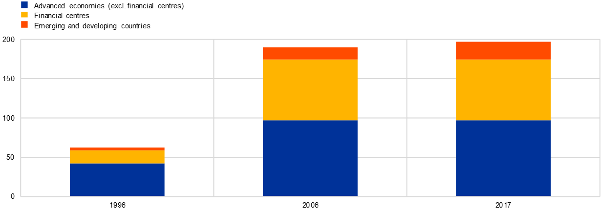 Notes: Aggregates for advanced economies, financial centres and emerging and developing countries are defined as in Lane, P. R. and Milesi-Ferretti, G. M. (2018), “The External Wealth of Nations Revisited: International Financial Integration in the Aftermath of the Global Financial Crisis”, IMF Economic Review, Vol. 66, No 1, International Monetary Fund, pp. 189-222.