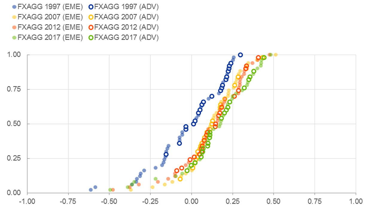 Notes: Net foreign currency exposures shown on the horizontal axis range between -1 and 1. The vertical axis presents the cumulative distribution (the proportion of countries) below each value on the horizontal axis for 1997, 2007, 2012 and 2017. The sample includes 50 advanced (ADV) and emerging (EME) countries.