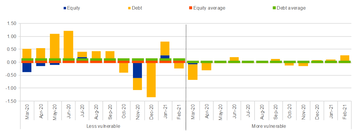 Notes: “Less vulnerable” countries are Belgium, Germany, France, the Netherlands, Austria and Finland; “more vulnerable” countries are Greece, Spain, Italy and Portugal. The averages are computed over the period since January 2008. The latest observation is for February 2021.