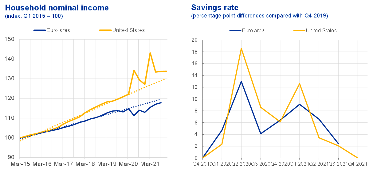 Notes: Aggregation of all euro area countries except Slovenia, Greece, Lithuania, Slovakia, Portugal and Belgium, and using estimated values for Spain. The latest observations are for December 2021 for the United States and the third quarter of 2021 for the euro area.