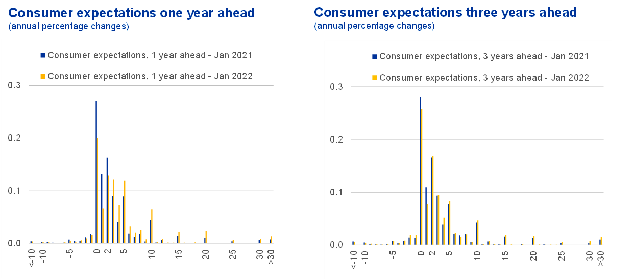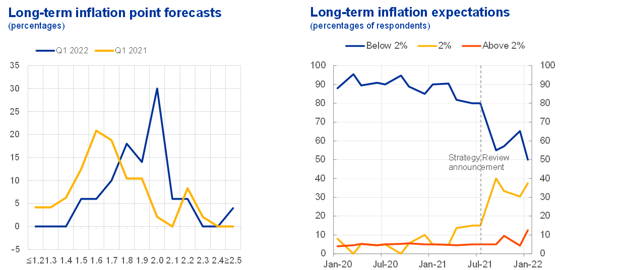 - Consumers’ expectations, which arguably feed most directly into wage negotiations, show a distinct but temporary “hump” shape compared with January last year (the distribution in January 2022 shifts out for 1-year ahead expectations but shifts back in for 3-year ahead expectations, see Chart 13). Longer-term expectations are also becoming more concentrated around the 2% level compared with a year ago (Chart 14, left panel), while a growing number of monetary analysts see inflation stabilising at 2%, with only a small proportion seeing inflation above this target (Chart 14, right panel).