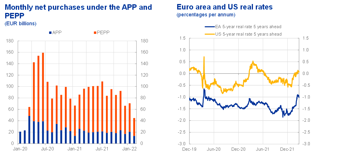 Notes: APP stands for asset purchase programme. PEPP stands for pandemic emergency purchase programme. The euro area real rate is the difference between the nominal overnight index swap rate and the inflation-linked swap (ILS) rate. The US real rate represents the difference between treasury yields and the US breakeven inflation rate. The latest observations are for 15 February 2022 for the left panel, and 24 February 2022 for the right panel.