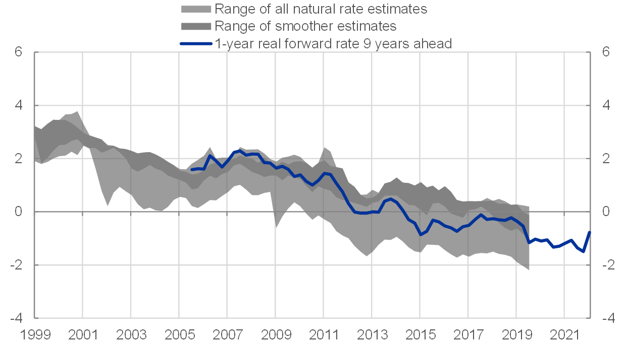 Sources: Brand, C., Bielecki, M. and Penalver, A. (eds.) (2018), “The natural rate of interest: estimates, drivers, and challenges to monetary policy”, Occasional Paper Series, No 217, ECB, December; Brand, C., Goy, G.; Lemke, W. (2020), “Natural Rate Chimera and Bond Pricing Reality”, DNB Working Papers, No 666, De Nederlandsche Bank, January; Ajevskis, Viktors (2018): “The natural rate of interest: information derived from a shadow rate model,” Latvijas Banka Working Paper, (2/2018); Brand, C. and Mazelis, F. (2019) “Taylor-rule consistent estimates of the natural rate of interest.” Working Paper Series 2257, European Central Bank; Fiorentini, G., Galesi, A., Pérez-Quirós, G. and Sentana, E. (2018): “The Rise and Fall of the Natural Interest Rate,” Banco de Espanã, Documentos de Trabajo, (1822); Geiger, F. and Schupp, F. (2018), “With a little help from my friends: survey-based derivation of euro area short rate expectations at the effective lower bound”, Bundesbank Discussion Paper, No 27; Holston, K., Laubach, T., and Williams, J. C. (2017). Measuring the natural rate of interest: International trends and determinants. Journal of International Economics, 108:59–75.; Jarocinski, Marek (2017): “VAR-based estimation of the euro area natural rate of interest,” ECB Draft Paper; Johannsen, B.K. and Mertens, E. (2021), “A Time-Series Model of Interest Rates with the Effective Lower Bound”, Journal of Money, Credit and Banking, 53: 1005-1046; ECB calculations.