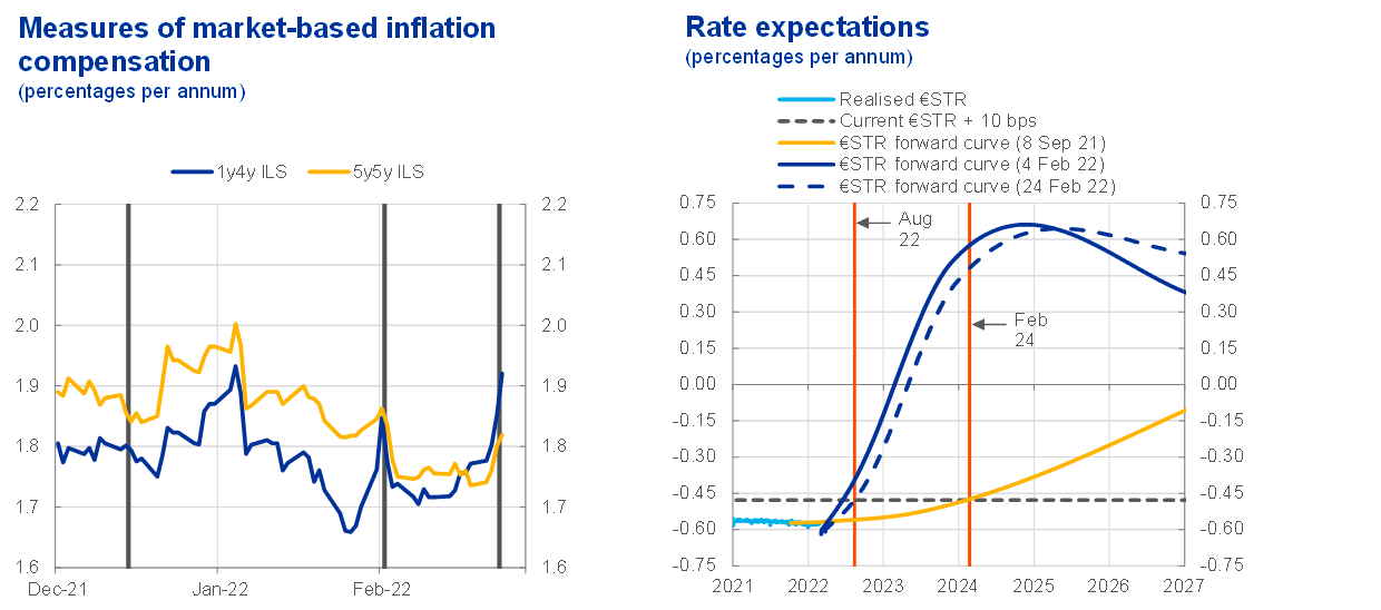 Notes: Left panel: The chart shows the one-year inflation linked-swap (ILS) rate four years ahead and the five-year ILS rate five years ahead. The solid vertical line refers to the day before the December Governing Council meeting (15 Dec), the day before the February Governing Council meeting (2 Feb) and the day of the Russian’s invasion of Ukraine (24 Feb). The solid vertical line refers to the day before the December Governing Council meeting (15 Dec). Latest observation: 24 February 2022. Right panel: The lift-off date is defined as the month during which the €STR forward rate exceeds by at least 10 bps the current €STR rate (respective red vertical lines). Latest observation: 24 February 2022 for realised €STR.