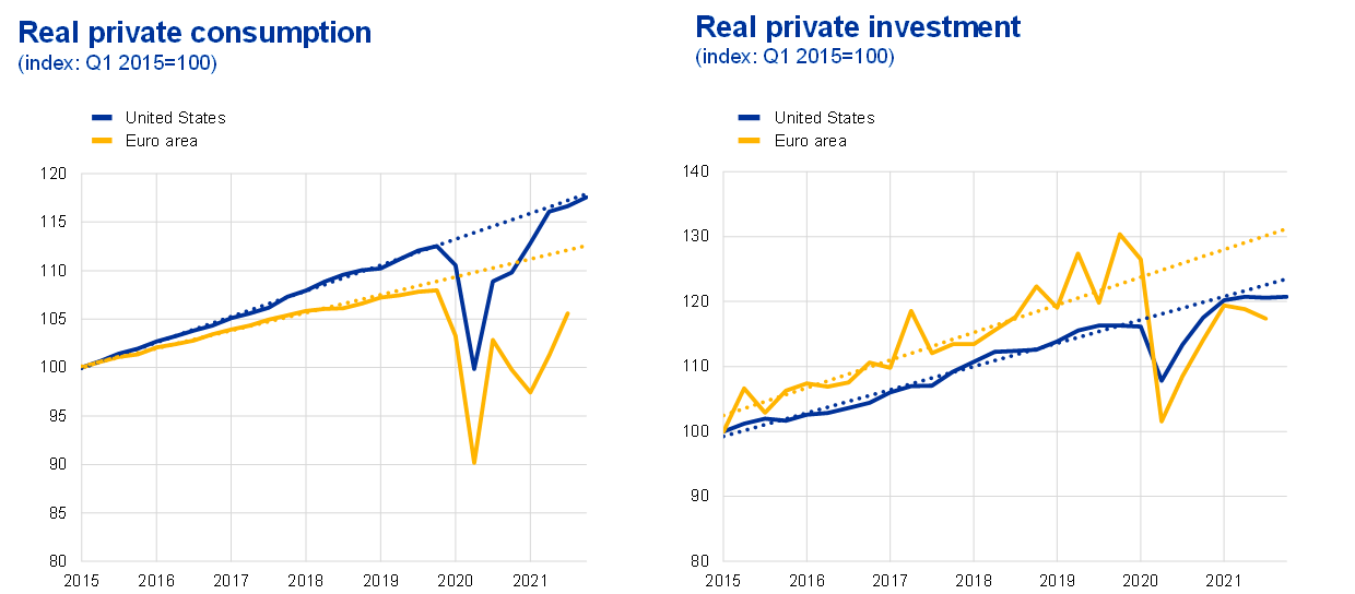 Sources: Left panel: Eurostat and Federal Reserve System; right panel: Eurostat, Bureau of Economic Analysis and ECB calculations.