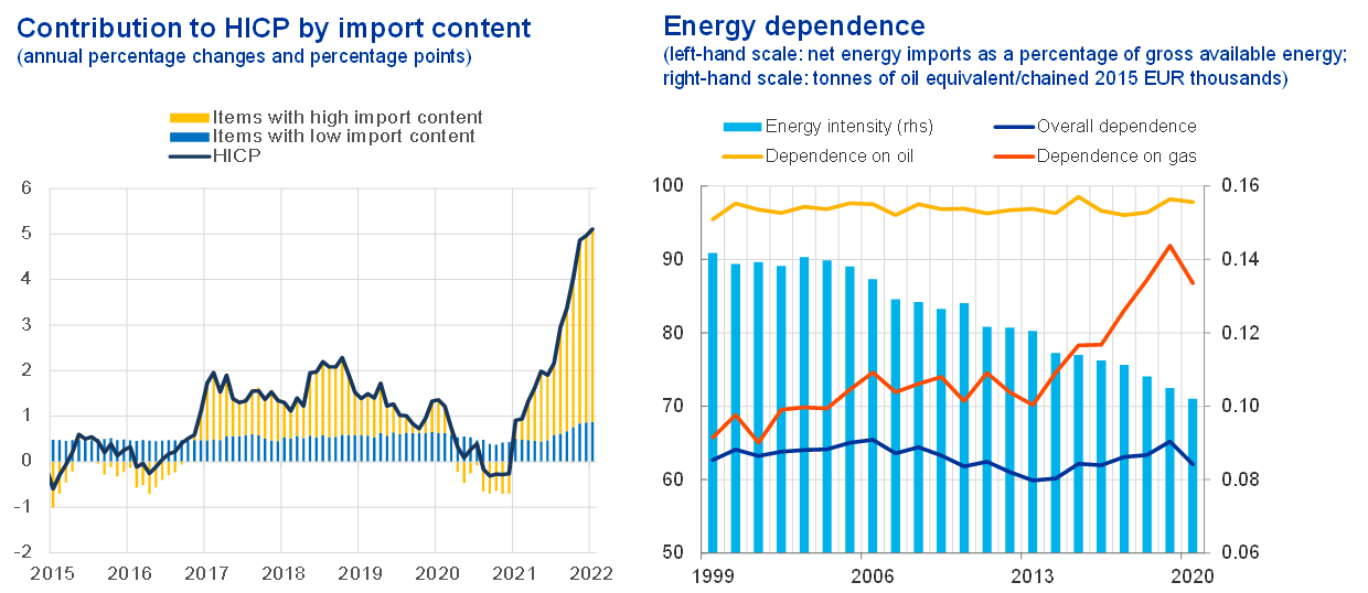 Around 60% of inflation in January was energy, of which the euro area is a net importer (Chart 4, right panel). This is the consequence of the recent extraordinary increases in oil and gas prices (Chart 5, left panel). These in turn mainly reflect shocks that compress energy supply, rather than stronger aggregate demand (Chart 5, right panel). The rise in the cost of energy has further accelerated after the Russian aggression against Ukraine.