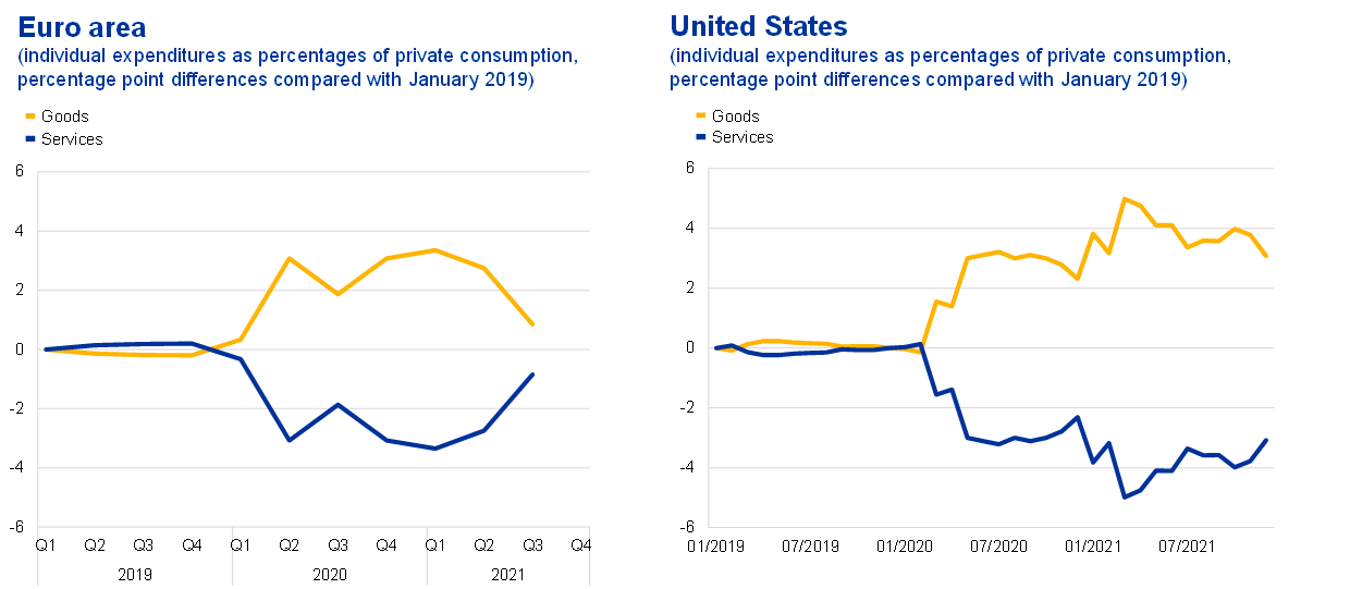 Inflation is also being fuelled by the global shift in consumer spending from services to manufactured goods at a time when the pandemic has disrupted production. This has translated into global supply chain bottlenecks, high durable goods prices and strong pipeline pressures. This effect, which also represents a supply shock for the euro area, is now being reabsorbed, but at a different pace in different economies (Chart 6).
