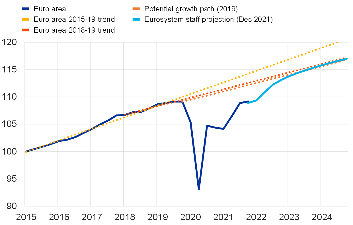 First, energy-driven inflation acts as a “tax”[4] on consumption and a brake on production, over time generating effects akin to an adverse demand shock. This adds to the uncertainty around the growth outlook, making it harder to judge when the economy is likely to reach full capacity.