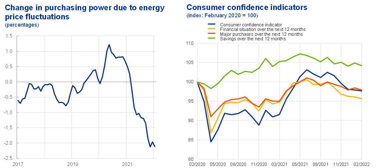 Notes: Changes in purchasing power due to energy price fluctuations are computed as the year-on-year percentage change in the real price of energy, weighted by the nominal energy expenditure share (see Edelstein, P. and Kilian, L. (2009), “How sensitive are consumer expenditures to retail energy prices?”, Journal of Monetary Economics, Vol. 56, No 6, pp. 766-779). A negative value indicates a loss in consumer purchasing power. The latest observations are for January 2022.