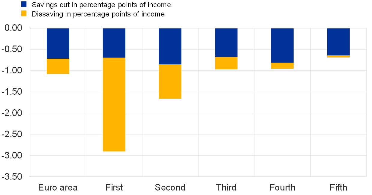 Notes: The chart refers to average aggregate effects across the income distribution, to savings cut for those households that have positive savings and rely on them to face the shock, and to dissaving for households that do not have positive savings and thus rely on alternative sources, like accumulated savings or payment deferrals, to face the shock. In 2021 the perceived average price change for utilities was 11%, and for transport services it was 9%. The actual inflation rates for energy items could suffer from an underestimation bias in cases of rising prices because domestic energy consumption is billed with a delay. The latest observations are for January 2022.