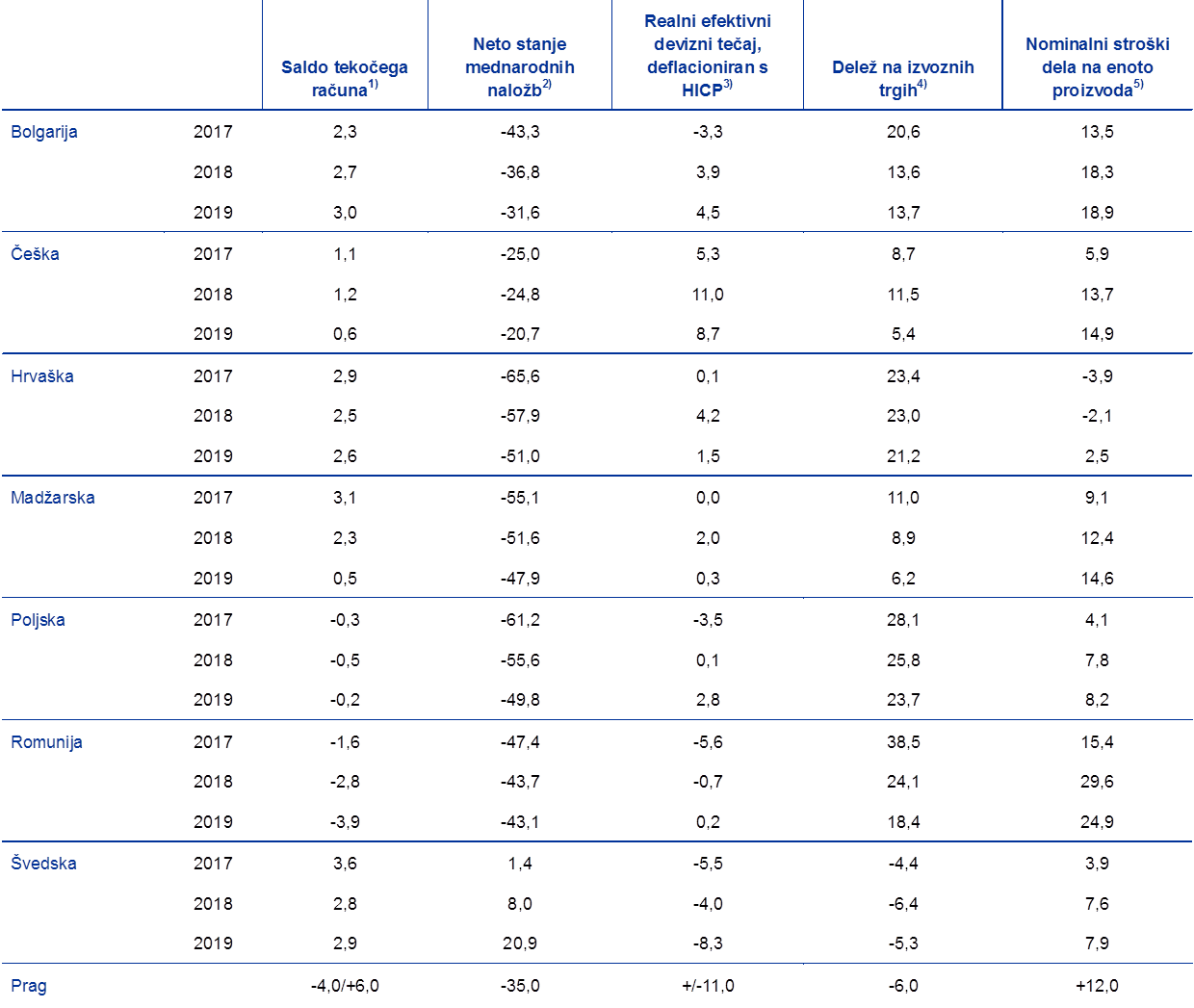 Skladno s preteklo prakso se dodatni dejavniki iz člena 140(1) Pogodbe presojajo v poglavju 5 (glej angleško izdajo poročila) v sklopu posameznih kriterijev, ki so opisani v okvirjih od 1 do 4. Zaradi celovitosti so v poglavju 3 predstavljeni kazalniki iz preglednice (vključno z opozorilnimi pragovi) za države, ki so zajete v tem poročilu, s čimer so zbrane vse razpoložljive informacije, potrebne za odkrivanje makroekonomskih in makrofinančnih neravnovesij, ki bi lahko zavirala uresničitev visoke stopnje trajnostne konvergence, kot določa člen 140(1) Pogodbe. Zlasti za države članice EU z odstopanjem, ki so predmet postopka v zvezi s čezmernimi neravnotežji, bi lahko le stežka trdili, da so dosegle visoko stopnjo trajnostne konvergence, kot določa člen 140(1) Pogodbe.