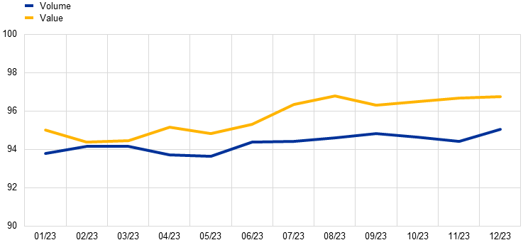 As traffic in T2S stabilised in its first few years of operation, settlement efficiency in volume terms became less volatile and averaged 96.85% between November 2018 and December 2019. Following the introduction of the new T2S statistical framework,[3] and consequently a new calculation method, settlement efficiency in volume terms decreased to 94.81% in January 2020. The particularly high volumes settled in March 2020 affected settlement efficiency, which declined to 92.81%. Since mid-2022, settlement efficiency in volume has experienced a steady increase, from 92.11% in July 2022 to 95.03% in December 2023.