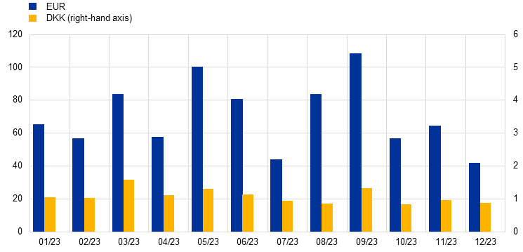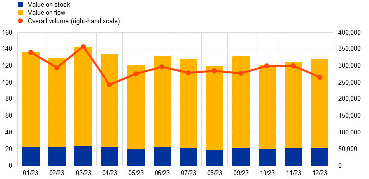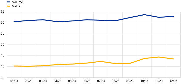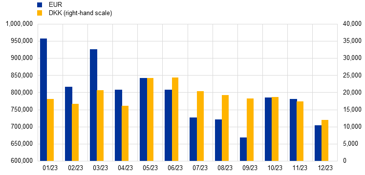 In 2023 T2S settled on average 699,868 transactions per day. Chart 2 shows the change in daily average T2S traffic in volume terms. The daily average volume per month ranged from 619,293 transactions (in August) to 785,845 (in December). The highest daily volume settled was on 2 October (1,463,872 transactions) and the lowest was on 3 January (437,796). The maximum was reached because of an exceptionally high volume of corporate actions in the Finnish market, which was supported by additional settlement cycles in T2S. The minimum occurred in a period of lower traffic owing to seasonality; the closure of the German stock market on 31 December was a key driver for the volumes settled two business days later. Overall, the number of transactions settled in T2S on a daily average basis in 2023 was slightly lower than in 2022 (707,879).