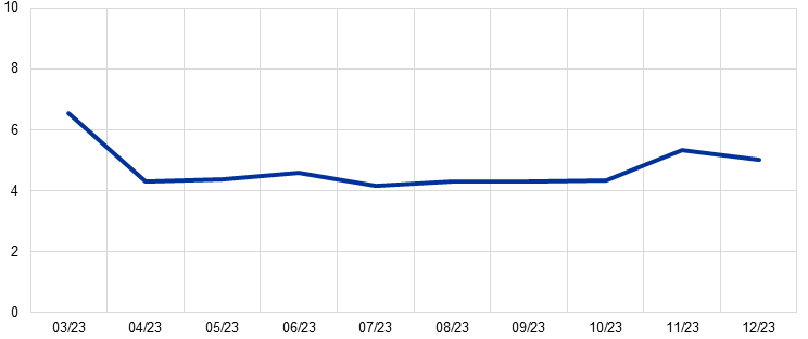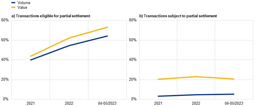Settlement efficiency in value terms averaged 97.52% between November 2018 and December 2019, largely in line with the average of 97.95% observed between September 2015 and October 2018. Following the methodological changes, the decrease in settlement efficiency between December 2019 and January 2020 was slightly larger in value terms than in volume terms (-2.33 percentage points compared with -1.73 percentage points). In line with volumes, settlement efficiency in value terms also dropped, falling to 88.95% in March 2020. Since mid-2022 settlement efficiency in value has followed an increasing trend, rising from 93.29% in July 2022 to 96.77% in December 2023.