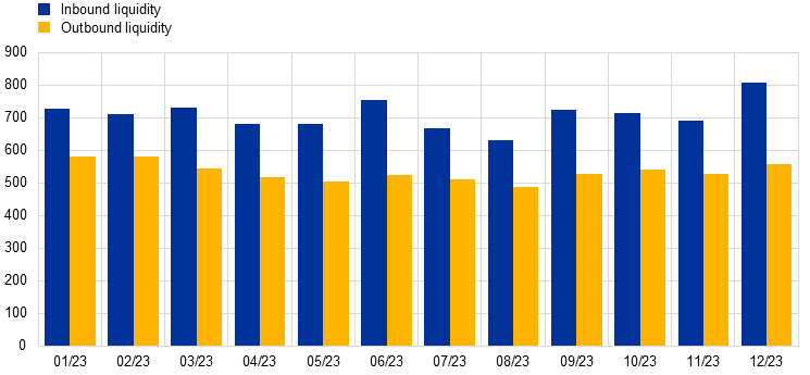 In 2023 T2S settled an average of €790.34 billion per day. Chart 7 shows the variation in daily average T2S traffic in value terms.[6] The daily average value ranged from €708.24 billion (in August) to €842.92 billion (in June). The highest daily value was recorded on 2 October (€1,032.19 billion), owing to an exceptionally high volume of corporate actions in the Finnish market, and the lowest on 3 January (€553.83 billion), because of seasonal effects, in line with the daily average volume. Overall, the daily average value settled in T2S in 2023 was higher than in 2022 (€716.67 billion).