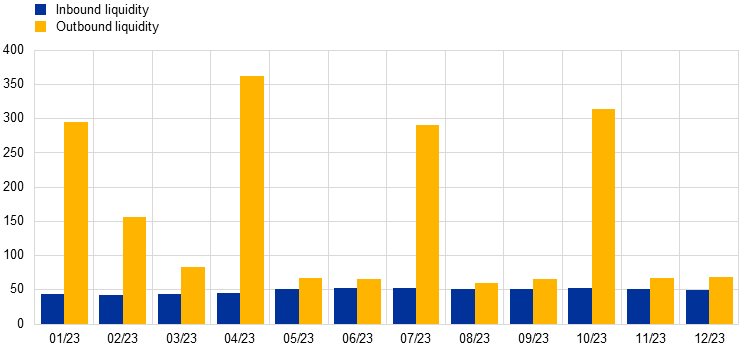 In 2023 T2S settled transactions with an average monthly value of €16.73 trillion. Chart 8 depicts the breakdown of total monthly traffic in terms of value by NTS and RTS. On average, RTS accounted for 67.61% of overall traffic in value terms in 2023 (€11.31 trillion per month), compared with 32.39% settled in NTS (€5.42 trillion). This compares with 67.56% settled in RTS and 32.44% in NTS in 2022. As shown in Chart 3, settlement was more evenly balanced between RTS and NTS in volume terms (47.65% and 52.35% respectively). This indicates that, in line with previous years, the RTS phases were more value-intensive than volume-intensive and featured transactions with a higher average value than in the NTS cycles. By contrast, the NTS cycles were more volume-intensive than value-intensive.