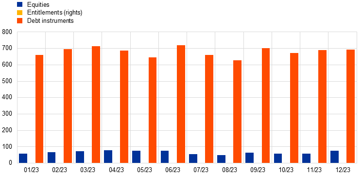 The three largest securities categories contributing to T2S traffic in terms of volume are equities, entitlements (rights) and debt instruments. Chart 5 shows the daily average volume settled for each of these three categories. In line with previous years, in 2023 equities represented the largest share of overall T2S traffic, with a daily average volume of 334,270 transactions (47.76%), followed by entitlements (rights) with 177,438 transactions (25.35%) and debt instruments with 104,159 transactions (14.88%). The remaining share (12.01%) is attributable to other types of securities. In 2022 the weight of equities and entitlements (rights) was higher (48.68% and 28.22% respectively), whereas the weight of debt instruments was lower (10.69%).