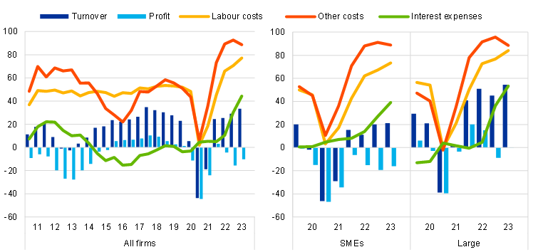 A net[1]16% of SMEs reported a deterioration in profits, while large firms signalled no change in profits on balance. Lower profitability reflects a rise in the cost of labour, with the net percentage of firms reporting an increase in labour costs (77%) reaching a new historical peak in the survey. The net percentage of firms indicating a rise in costs for materials and energy (89%) remained high, although it was slightly below the figure reported in the previous survey round. This reflected an easing in supply bottlenecks, along with falling energy prices. Increasing interest expenses also had a negative impact on profitability, with the net percentage standing at its highest level since the survey started. Increases in labour costs and interest expenses were reported more broadly by large firms than by SMEs, while the net percentage of firms indicating an increase in other costs was similar across firm sizes.