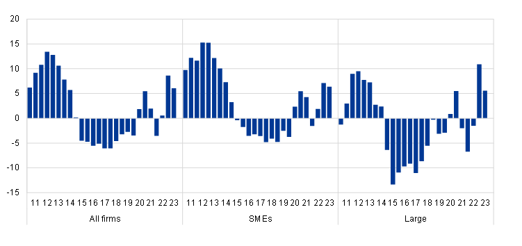 Despite tighter financing conditions, the net percentage of firms reporting obstacles to obtaining a bank loan remained broadly unchanged at 7%, with net percentages of 5% for large firms and 9% for SMEs.