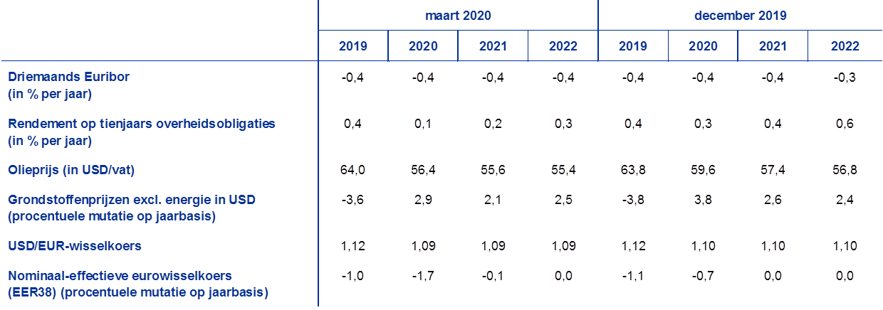 Vergeleken met de projecties van december 2019 omvatten de technische aannames lagere olieprijzen, een lagere effectieve wisselkoers van de euro en een lagere langetermijnrente. De technische aannames met betrekking tot de rente en de grondstoffenprijzen zijn gebaseerd op de marktverwachtingen, met als afsluitdatum 18 februari 2020. Voor de korte rente wordt de driemaands Euribor als referentiepunt gebruikt, waarbij de marktverwachtingen voor de rente worden afgeleid van termijncontracten. Deze methodologie levert voor deze korte rente een gemiddelde stand op van -0,4% voor de gehele projectieperiode. De marktverwachtingen voor het nominale rendement op tienjaars overheidsobligaties uit het eurogebied duiden op een gemiddeld renteniveau van 0,1% voor 2020, 0,2% voor 2021 en 0,3% voor 2022.[2] Ten opzichte van de projecties van december 2019 zijn de marktverwachtingen voor de korte rente neerwaarts bijgesteld met circa 10 basispunten voor 2022, terwijl de nominale rendementen op tienjaars overheidsobligaties uit het eurogebied naar beneden zijn bijgesteld met ongeveer 20 basispunten voor 2020 tot en met 2022.