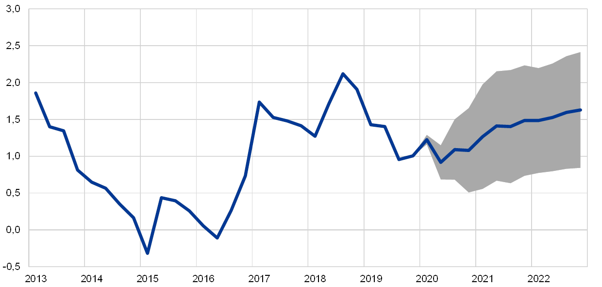 De HICP-inflatie zal naar verwachting licht afnemen, van 1,2% in 2019 tot 1,1% in 2020, onder invloed van de temperende effecten van de energieprijzen, en daarna geleidelijk aantrekken tot 1,6% in 2022 (zie Grafiek 2). Dat de totale inflatie in 2020 lager uitkomt dan in 2019 komt door een aanzienlijke daling van de HICP-energieprijzen, die weer wordt veroorzaakt door de zwakke ontwikkeling van de olieprijzen (tot de afsluitdatum voor de technische aannames), mede vanwege de uitbraak van Covid-19. Verwacht wordt dat de HICP-energie-inflatie het hele jaar negatief blijft en pas in het tweede kwartaal van 2021 positief wordt, als de curve van de olieprijsfutures afvlakt, maar ook onder invloed van een aantal opwaartse effecten van verhogingen van indirecte belastingen op energie. Hoewel de zwakkere vraagvooruitzichten als gevolg van de uitbraak van Covid-19 waarschijnlijk ook neerwaartse druk zullen uitoefenen op de prijzen voor grondstoffen exclusief energie, zal die naar verwachting grotendeels worden gecompenseerd door de prijsopdrijvende effecten van verstoringen in de toeleveringsketen. Aangenomen wordt dat de prijsontwikkelingen voor voedingsmiddelen zullen blijven bijdragen tot de HICP-voedselinflatie, maar het effect neemt gedurende de projectieperiode geleidelijk af, wat betekent dat de HICP-voedselinflatie vanaf medio 2020 een licht dalend verloop vertoont. Verwacht wordt dat de HICP-inflatie exclusief voedingsmiddelen en energie in 2020 rond 1,2 à 1,3% zal schommelen en geleidelijk zal aantrekken tot 1,4% in 2021 en 1,5% in 2022. Voor het binnenland is de verwachting dat het voorziene herstel van de bedrijvigheid de stijging van de HICP-inflatie exclusief voedingsmiddelen en energie gedurende de projectieperiode zal ondersteunen. De stijging van deze inflatiemaatstaf zal ook worden ondersteund door de vrij robuuste loongroei en het herstel van de winstmarges. Extern moet de stijging van de grondstoffenprijzen exclusief energie en van de invoerprijzen bijdragen tot de verwachte versterking van de HICP-inflatie exclusief voedingsmiddelen en energie gedurende de projectieperiode.