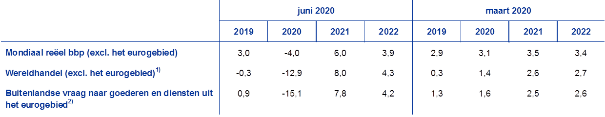 In 2020 als geheel zal het mondiale reële bbp exclusief het eurogebied naar verwachting met 4,0% dalen. Dit tempo getuigt van een snellere en ook veel sterkere krimp dan tijdens de wereldwijde financiële crisis van 2008-2009. Als gevolg hiervan zal de bedrijvigheid in de eerste twee kwartalen van dit jaar sterk afnemen en zich vanaf het derde kwartaal herstellen. Met de versoepeling van de strikte beheersingsmaatregelen zal het mondiale reële bbp in eerste instantie weer opveren, maar in de kwartalen daarna zal het herstel geleidelijker verlopen. Op grond hiervan wordt voor het reële mondiale bbp exclusief het eurogebied een groei voorzien van 6,0% in 2021 en van 3,9% in 2022. Ten opzichte van de prognoses van medewerkers van de ECB van maart 2020 is de mondiale groei voor dit jaar aanzienlijk neerwaarts bijgesteld, terwijl de groei op de middellange termijn naar verwachting iets sterker zal zijn. Deze herzieningen impliceren ook dat het niveau van de mondiale productie lager blijft dan in de projecties van maart 2020 werd voorzien. Voor opkomende markteconomieën wordt een gematigder herstel verwacht dan bij eerdere perioden van economische neergang. Dat komt doordat ze momenteel getroffen worden door een combinatie van negatieve schokken, waaronder de gezondheidscrisis, krappe financieringscondities, negatieve effecten op de ruilvoet voor grondstoffenexporteurs en een aanzienlijke uitstroom van kapitaal.