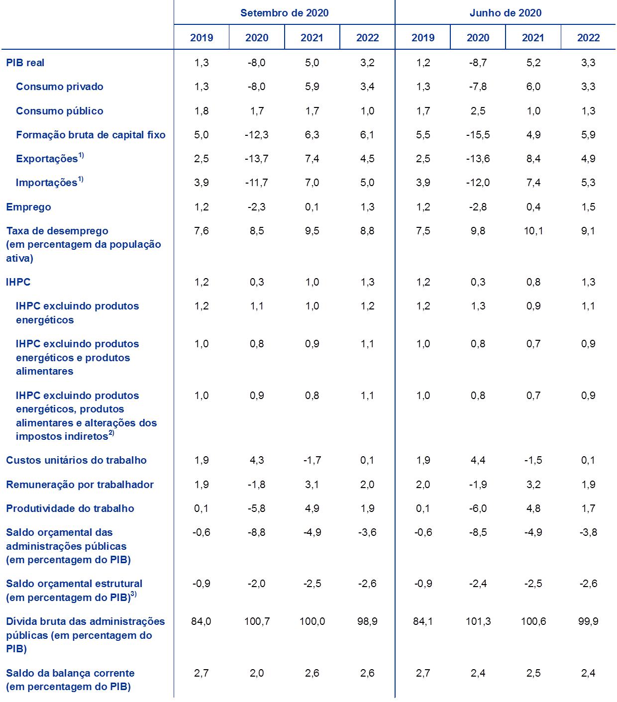 Notas: O PIB real e as suas componentes, os custos unitários do trabalho, a remuneração por trabalhador e a produtividade do trabalho têm por base dados corrigidos de sazonalidade e de dias úteis. Este quadro não apresenta intervalos em torno das projeções. Tal reflete o facto de o cálculo normal dos intervalos (com base em erros de projeção históricos) não constituir, nas presentes circunstâncias, uma indicação fiável da incerteza sem precedentes que envolve as projeções atuais. Por conseguinte, a fim de melhor ilustrar a incerteza atual, são fornecidos, na caixa 3, cenários alternativos baseados em diferentes pressupostos relativos à evolução futura da pandemia de COVID‑19 e às medidas de contenção associadas.