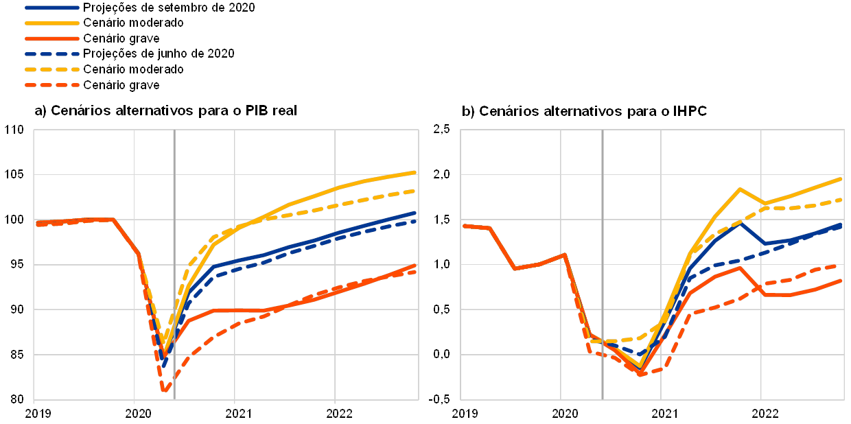 Tendo em conta a incerteza acerca da evolução da pandemia, foram preparados dois cenários alternativos. O cenário moderado considera o choque como temporário, com uma rápida implementação de uma solução médica, que permite uma nova flexibilização das medidas de contenção. Neste cenário, o PIB real diminuiria 7,2% no presente ano, registando depois uma forte recuperação em 2021. No final do horizonte de projeção, o PIB real excederia ligeiramente o nível esperado nas projeções de dezembro de 2019 elaboradas por especialistas do Eurosistema, com a inflação a atingir 1,8% em 2022. Em contraste, o cenário grave com um forte ressurgimento da pandemia implica um retorno a medidas de contenção rigorosas. Estas pesam severamente sobre a atividade económica e provocam perdas de atividade substanciais e permanentes. Neste cenário, o PIB real desce 10% em 2020. No final do horizonte de projeção, situa‑se cerca de 9% abaixo do nível avançado nas projeções de dezembro de 2019 elaboradas por especialistas do Eurosistema, sendo a inflação apenas de 0,7% em 2022.