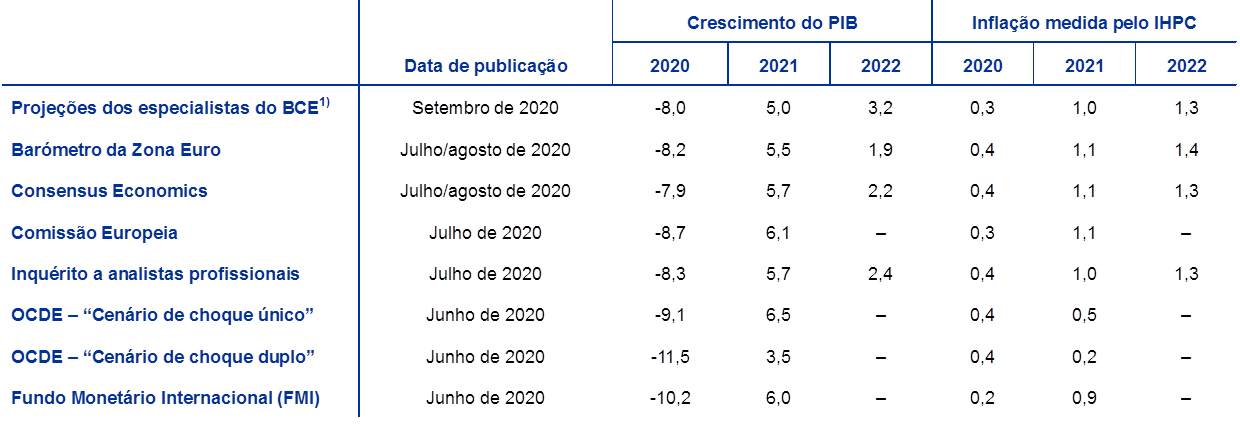 Fontes: Barómetro da Zona Euro da MJEconomics, de 17 de agosto de 2020, sendo os dados para 2022 retirados do inquérito de julho de 2020; previsões da Consensus Economics, de 14 de agosto de 2020, sendo os dados para 2022 retirados do inquérito de julho de 2020; previsões económicas intercalares do verão de 2020, elaboradas pela Comissão Europeia; inquérito do BCE a analistas profissionais relativo ao terceiro trimestre de 2020, realizado entre 30 de junho e 6 de julho de 2020; World Economic Outlook do FMI, de 24 de junho de 2020; Economic Outlook, nº 107, da OCDE, de junho de 2020. O cenário de choque duplo da OCDE refere‑se a uma situação em que um segundo surto menos forte do vírus irrompe no quarto trimestre de 2020. No cenário de choque único, as medidas de contenção permitem superar com êxito o presente surto. O quadro inclui ambos os cenários, porque a OCDE atribui a mesma importância a ambos, sem definir uma projeção de referência única.