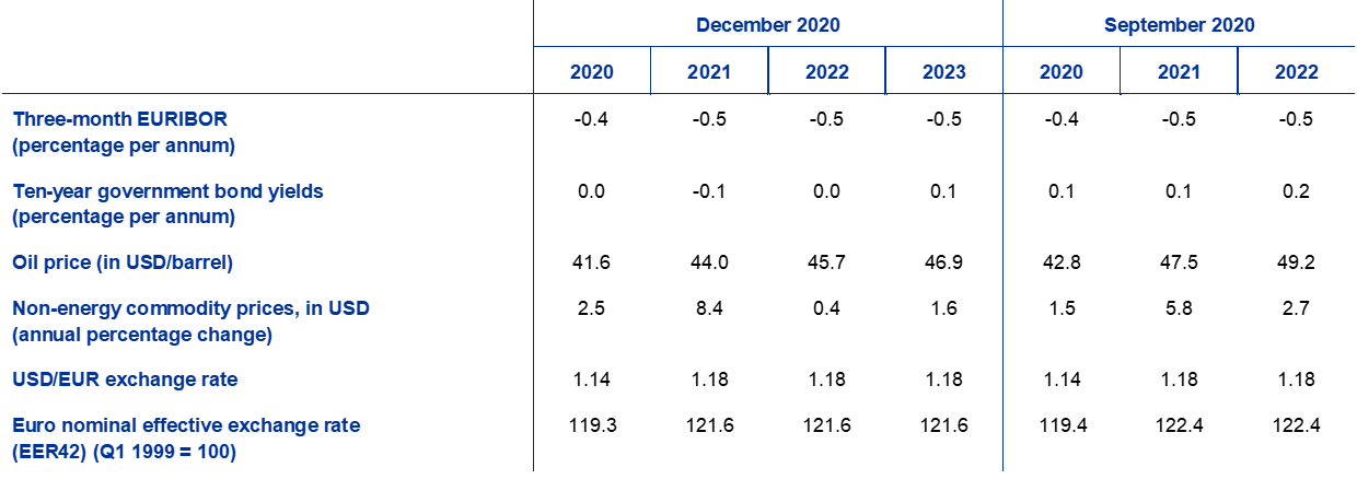 Compared with the September 2020 ECB staff projections, the current technical assumptions include lower long-term interest rates, lower oil prices and a slightly weaker effective exchange rate of the euro. The technical assumptions about interest rates and commodity prices are based on market expectations with a cut-off date of 18 November 2020. Short-term interest rates refer to the three-month EURIBOR, with market expectations derived from futures rates. The methodology gives an average level for these short-term interest rates of -0.4% in 2020 and -0.5% in 2021-23. The market expectations for euro area ten-year nominal government bond yields imply an average annual level of 0.0% for 2020, -0.1% for 2021, 0.0% for 2022 and 0.1% for 2023.[2] Compared with the September 2020 ECB staff projections, market expectations for short-term interest rates are unchanged, while euro area ten-year nominal government bond yields have been revised down by around 20 basis points for 2021-22.