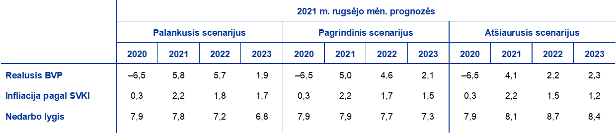 Atsižvelgiant į tebesitęsiantį neapibrėžtumą dėl tolesnės COVID-19 pandemijos raidos ir jos poveikio ekonomikai, šiame intarpe aptariami du alternatyvūs 2021 m. rugsėjo mėn. prognozių scenarijai. Jie parodo galimą įvairų COVID-19 pandemijos poveikį euro zonos ekonomikai.