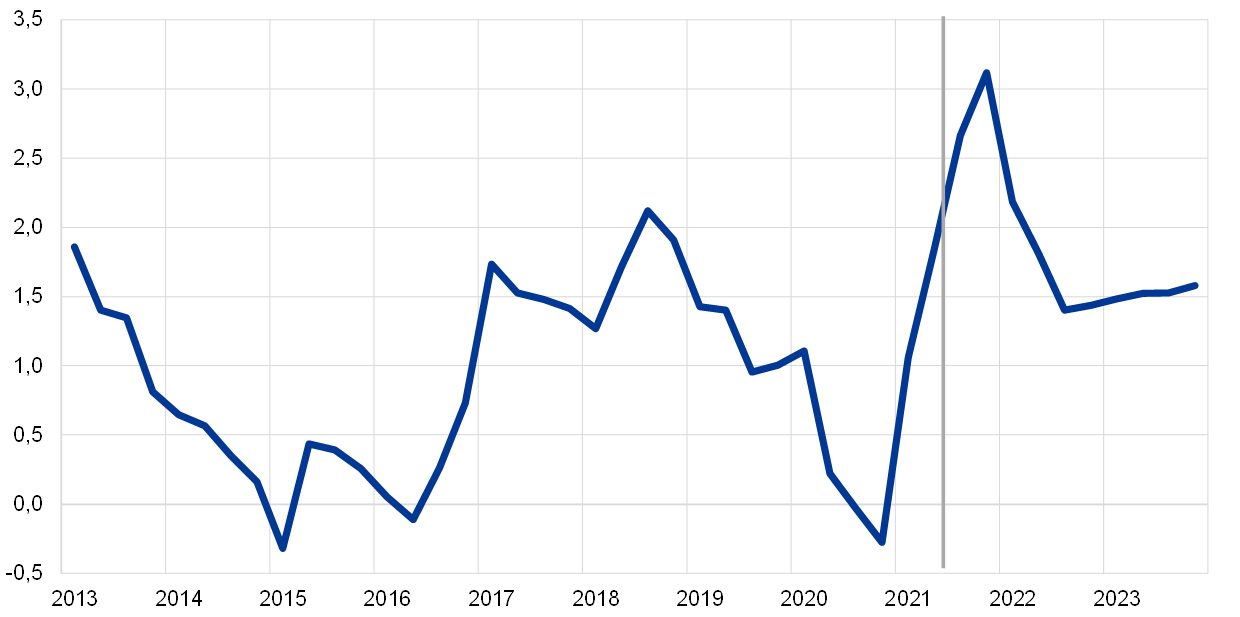 - Este valor foi revisto em alta, partindo da estimativa provisória de 2,0% inicialmente publicada pelo Eurostat e incluída nas projeções dos especialistas do BCE apresentadas nos gráficos 1 e 2.