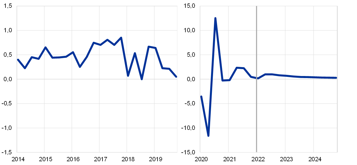 Uwagi: Dane odsezonowane i wyrównane dniami roboczymi. Dane historyczne mogą się różnić od najnowszych danych Eurostatu, których publikacja przypadła po dacie granicznej projekcji. Pionowa linia wyznacza początek horyzontu projekcji.