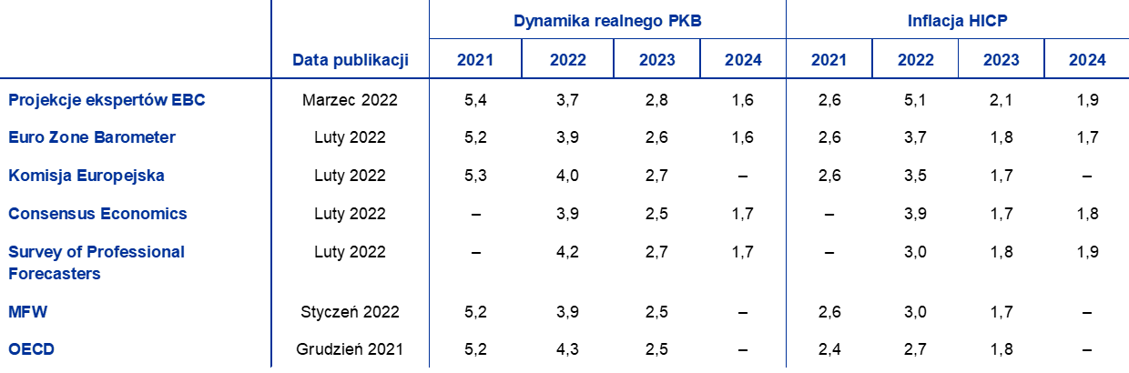 Projekcje ekspertów EBC z marca 2022 dotyczące wzrostu gospodarczego na rok 2022 są niższe niż pozostałe prognozy, a projekcje inflacji na 2022 są dużo powyżej pozostałych prognoz. Wynika to z uwzględnienia skutków konfliktu w Ukrainie i nowszych danych. Dla późniejszych lat horyzontu projekcji różnice są mniejsze. Mimo że w porównaniu z projekcjami ekspertów Eurosystemu z grudnia 2021 wzrost gospodarczy na 2022 został zrewidowany w dół, marcowe projekcje ekspertów EBC są tylko nieznacznie poniżej innych niedawnych projekcji dotyczących 2022 i nadal nieco powyżej innych prognoz na 2023. Jeśli chodzi o inflację, projekcje ekspertów EBC na 2022 są dużo wyższe niż pozostałe prognozy, ponieważ przyjęcie późniejszej daty granicznej pozwoliło uwzględnić szybkie szacunki inflacji HICP z lutego 2022 oraz założenia techniczne zaktualizowane po inwazji Rosji na Ukrainę. Projekcje ekspertów EBC na 2024 – zarówno dla wzrostu, jak i dla inflacji – mieszczą się w dużo węższym przedziale innych prognoz.