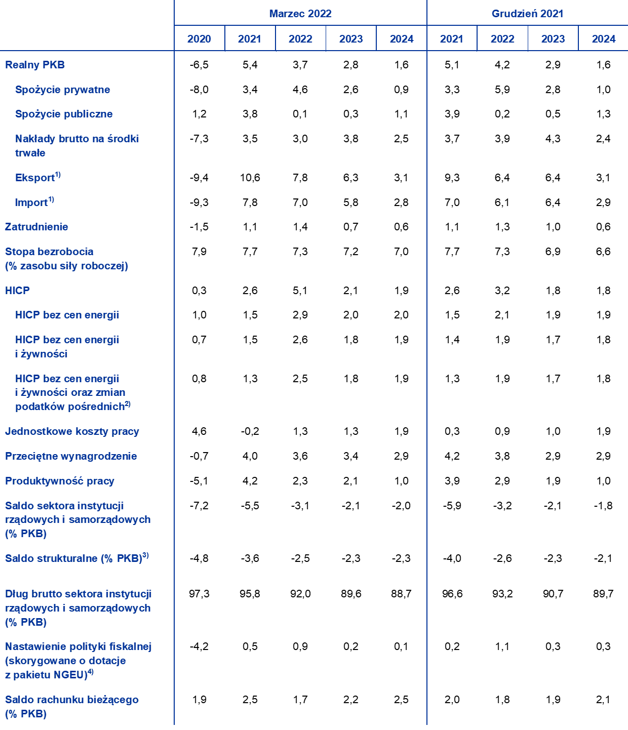W porównaniu z projekcjami z grudnia 2021 wzrost realnego PKB na rok 2022 zrewidowano w dół o 0,5 pkt proc., na 2023 – o 0,1 pkt proc., natomiast projekcje na 2024 pozostały bez zmian. Pogorszenie się perspektyw na 2022 jest w dużej mierze odzwierciedleniem wpływu kryzysu ukraińskiego na ceny energii, poziom zaufania i handel. Częściowo równoważy je dodatni efekt przeniesienia wynikający z korekt w górę danych za 2021. W 2023 i 2024 wzrostowe oddziaływanie poprawy konkurencyjności cenowej związanej z wyższą presją cenową wśród niektórych głównych partnerów handlowych jest zasadniczo równoważone przez wyższe stopy procentowe przyjęte w założeniach i ujemny wpływ wzrostu cen energii.