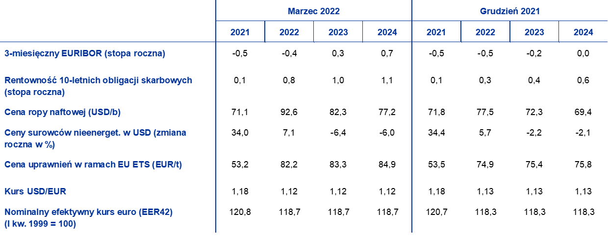 W porównaniu z projekcjami z grudnia 2021 założenia techniczne obejmują znacznie wyższe ceny ropy i innych nośników energii oraz wyższe stopy procentowe. Podstawą założeń technicznych dotyczących stóp procentowych i cen surowców są oczekiwania rynkowe; jako datę graniczną przyjęto 28 lutego 2022[3]. Stopy krótkoterminowe opierają się na 3‑miesięcznej stawce EURIBOR, a oczekiwania rynkowe są wyprowadzane ze stawek kontraktów terminowych. Z tej metody wynika średni poziom krótkoterminowych stóp procentowych równy ‑0,4% w 2022, 0,3% w 2023 i 0,7% w 2024. Nominalna średnioroczna rentowność 10‑letnich obligacji skarbowych dla strefy euro wynikająca z oczekiwań rynkowych w 2022 wynosi 0,8%, po czym w horyzoncie projekcji stopniowo wzrasta i w 2024 osiąga 1,1%[4]. W porównaniu z projekcjami z grudnia 2021 oczekiwania rynkowe dotyczące krótkoterminowych stóp procentowych zrewidowano w górę o ok. 10 pkt bazowych na 2022, 50 pkt bazowych na 2023 i 70 pkt bazowych na 2024, ze względu na oczekiwane zacieśnianie polityki pieniężnej na całym świecie pod wpływem utrzymującego się nadspodziewanie wysokiego wzrostu inflacji. To doprowadziło także do rewizji w górę rentowności długoterminowych obligacji skarbowych o ok. 50−60 pkt bazowych w horyzoncie projekcji.