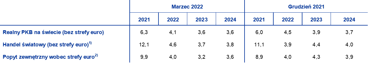 Przewiduje się, że gospodarka światowa w średnim okresie pozostanie na ścieżce wzrostu, choć jego tempo będzie nieco wolniejsze, wobec napięć geopolitycznych i wygasania bodźców polityki publicznej związanych z pandemią. W 2021 wzrostowi gospodarczemu na świecie sprzyjało utrzymywanie wsparcia ze strony polityki publicznej. W stosunku do projekcji z grudnia 2021 dynamikę wzrostu zrewidowano w górę z powodu lepszych, niż się spodziewano, wyników w drugiej połowie roku, zwłaszcza w dużych gospodarkach, np. Chinach i Stanach Zjednoczonych. Przewiduje się, że światowa dynamika realnego PKB (z wyłączeniem strefy euro) od 2022 będzie się zbliżać do bardziej umiarkowanego poziomu. Oprócz skutków wariantu omikron i inwazji Rosji na Ukrainę na spowolnienie spożycia prywatnego wpłynie rosnąca inflacja. Oczekuje się, że potem wystąpi efekt „ograniczenia prędkości”, spowodowany trudniejszymi warunkami na rynku pracy, które będą częściowo neutralizowane przez spodziewane ustępowanie zatorów podażowych. Do spadku dynamiki wzrostu w horyzoncie projekcji ma przyczynić się także zmniejszenie wsparcia ze strony polityki. W 2021 banki centralne w niektórych gospodarkach wschodzących, wobec silnej presji inflacyjnej, zaczęły wycofywać bodźce związane z pandemią. W 2022 w gospodarkach rozwiniętych już odchodzi się od łagodzenia polityki pieniężnej lub ma to według oczekiwań wkrótce nastąpić. Od grudnia 2021 Bank of England dwukrotnie podniósł stopy procentowe, a amerykański Federalny Komitet Otwartego Rynku zasygnalizował zmianę nastawienia polityki i wskazał na szybsze tempo normalizacji polityki pieniężnej USA, niż wcześniej oczekiwano. W związku z tym oczekuje się, że wzrost gospodarczy w Stanach Zjednoczonych spowolni, również ze względu na słabsze bodźce fiskalne, niż uprzednio zakładano. Jeśli chodzi o gospodarki wschodzące, dynamika wzrostu według projekcji ma się obniżyć w Brazylii, głównie z powodu drastycznego zacieśnienia polityki pieniężnej wobec nasilającej się presji inflacyjnej, oraz Turcji, gdzie zaburzenia na rynkach wynikały z dużej niepewności politycznej i bardzo wysokiej inflacji, co niekorzystnie przełożyło się na spożycie i inwestycje. Chociaż nie można wykluczyć pojawienia się nowych, bardziej agresywnych wariantów koronawirusa, wpływ pandemii na perspektywy gospodarki światowej powinien się stopniowo zmniejszać. W porównaniu z projekcjami z grudnia 2021 wzrost realnego PKB w horyzoncie projekcji zrewidowano w dół (na rok 2022 o 0,4 pkt proc., na rok 2023 o 0,3 pkt proc., a na 2024 o 0,1 pkt proc.). W krótkim okresie niekorzystny wpływ powyższych czynników jest częściowo równoważony przez dodatni efekt przeniesienia, natomiast w dalszej części horyzontu projekcji rewizja w dół wynika z osłabienia wzrostu w Stanach Zjednoczonych oraz Rosji i kilku innych dużych gospodarkach wschodzących.