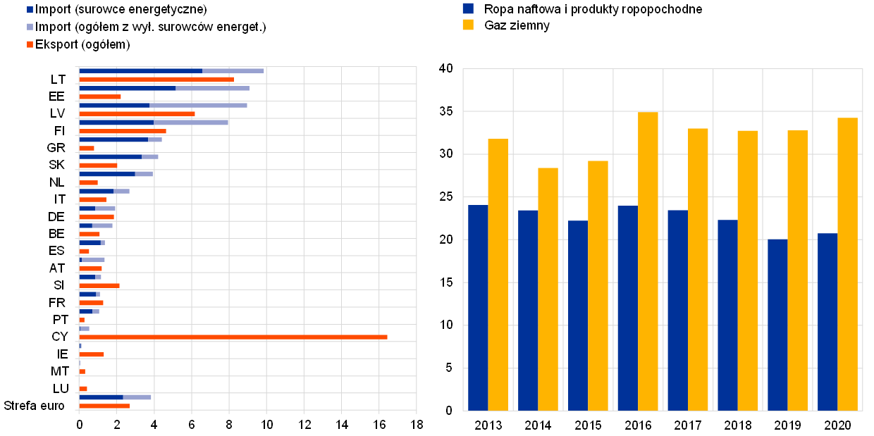 Handel strefy euro z Rosją (lewa część) i zależność strefy euro od rosyjskich surowców energetycznych (prawa część)