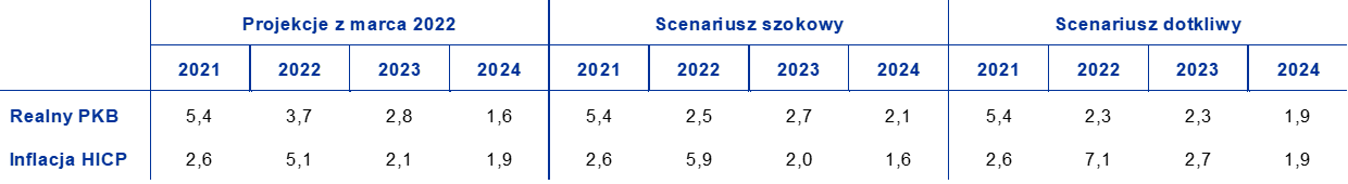 Wobec dużej niepewności co do wpływu wojny w Ukrainie na gospodarkę w strefie euro opracowano – oprócz scenariusza bazowego – dwa alternatywne scenariusze. W porównaniu ze scenariuszem bazowym w scenariuszu szokowym przyjęto, że na Rosję są nałożone surowsze sankcje, które prowadzą do zakłóceń w globalnych łańcuchach wartości. Utrzymujące się ograniczenia dostaw gazu z Rosji skutkują wzrostem cen energii i zmniejszeniem się produkcji w strefie euro. Jest to jednak tylko tymczasowe, ponieważ gaz zostaje zastąpiony innymi źródłami energii. Dodatkowo napięcia geopolityczne utrzymują się dłużej niż w scenariuszu bazowym i skutkują dodatkowymi zaburzeniami finansowymi i trwalszą niepewnością. W takim scenariuszu wzrost PKB w strefie euro w 2022 jest o 1,2 pkt proc. mniejszy niż w scenariuszu bazowym, a inflacja – o 0,8 pkt proc. wyższa. Dla 2023 różnice są mniejsze. Wzrost w 2024 jest nieco mocniejszy niż w scenariuszu bazowym ze względu na dostosowanie się gospodarki po głębszych spadkach aktywności w latach 2022 i 2023. W miarę powracania rynków ropy i gazu do równowagi wywindowane ceny energii stopniowo się obniżają i powodują spadek inflacji poniżej poziomu ze scenariusza bazowego, zwłaszcza w 2024. Scenariusz bardziej dotkliwy obejmuje, oprócz elementów scenariusza szokowego, mocniejszą reakcję cen energii na drastyczniejsze ograniczenia podaży, głębszą korektę wycen na rynkach finansowych i większe efekty drugiej rundy związane z rosnącymi cenami energii. W tym scenariuszu wzrost PKB w 2022 jest o 1,4 pkt proc. niższy niż w scenariuszu bazowym, natomiast inflacja – o 2,0 pkt proc. wyższa. Również w 2023 występuje znacznie niższy wzrost i wyższa inflacja niż w scenariuszu bazowym. Wskutek trwalszych zaburzeń wywołanych wojną zakres dostosowania wzrostu w 2024 jest stosunkowo niewielki, podczas gdy mocniejsze efekty drugiej rundy równoważą oddziaływanie spadających cen energii na obniżenie się inflacji.