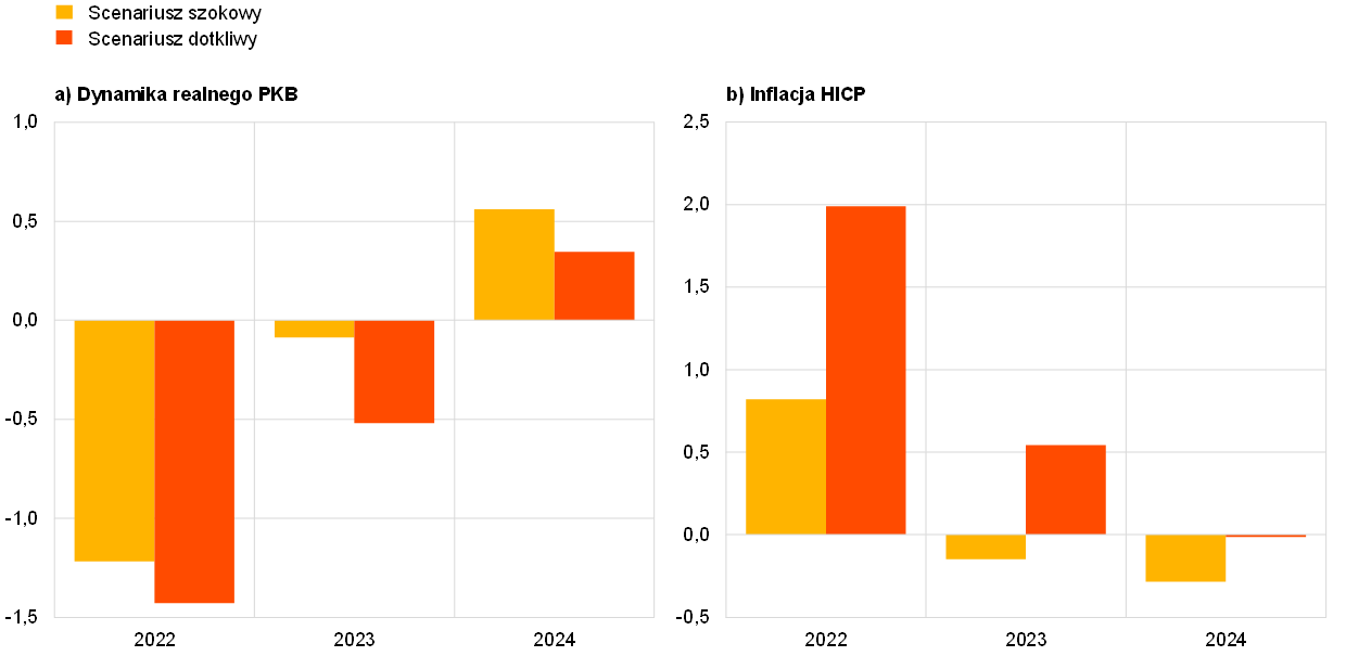 W obu scenariuszach średnioroczna inflacja w 2022 jest bardzo wysoka, ale później stopniowo się obniża i w 2024 w scenariuszu szokowym wypada poniżej poziomu z projekcji bazowych wynoszącego 1,9%, a w scenariuszu dotkliwym osiąga ten poziom (tabela i wykres B). Na inflację HICP największy wpływ mają założenia dotyczące cen energii. W scenariuszu dotkliwym wyższa wrażliwość tych cen na odcięcie dostaw i mniejsza liczba czynników równoważących jej skutki prowadzą do większego i trwalszego wybicia inflacji HICP. W związku z tym wyższe ceny surowców oddziałują na wzrost inflacji w 2022 o 0,8 pkt proc. w scenariuszu szokowym i o 2,0 pkt proc. w scenariuszu dotkliwym. W scenariuszu dotkliwym presja wzrostowa utrzymuje się w 2023: inflacja HICP jest o 0,6 pkt proc. wyższa niż w scenariuszu bazowym. W miarę powracania rynków ropy i gazu do równowagi wywindowane ceny energii stopniowo się obniżają, co w połączeniu z osłabieniem aktywności gospodarczej w strefie euro prowadzi do spadku inflacji. W scenariuszu dotkliwym jeszcze wyższe ceny energii oraz mocniejsze efekty drugiej rundy powodują, że w 2024 inflacja HICP powraca do poziomu z projekcji bazowych wynoszącego 1,9%.