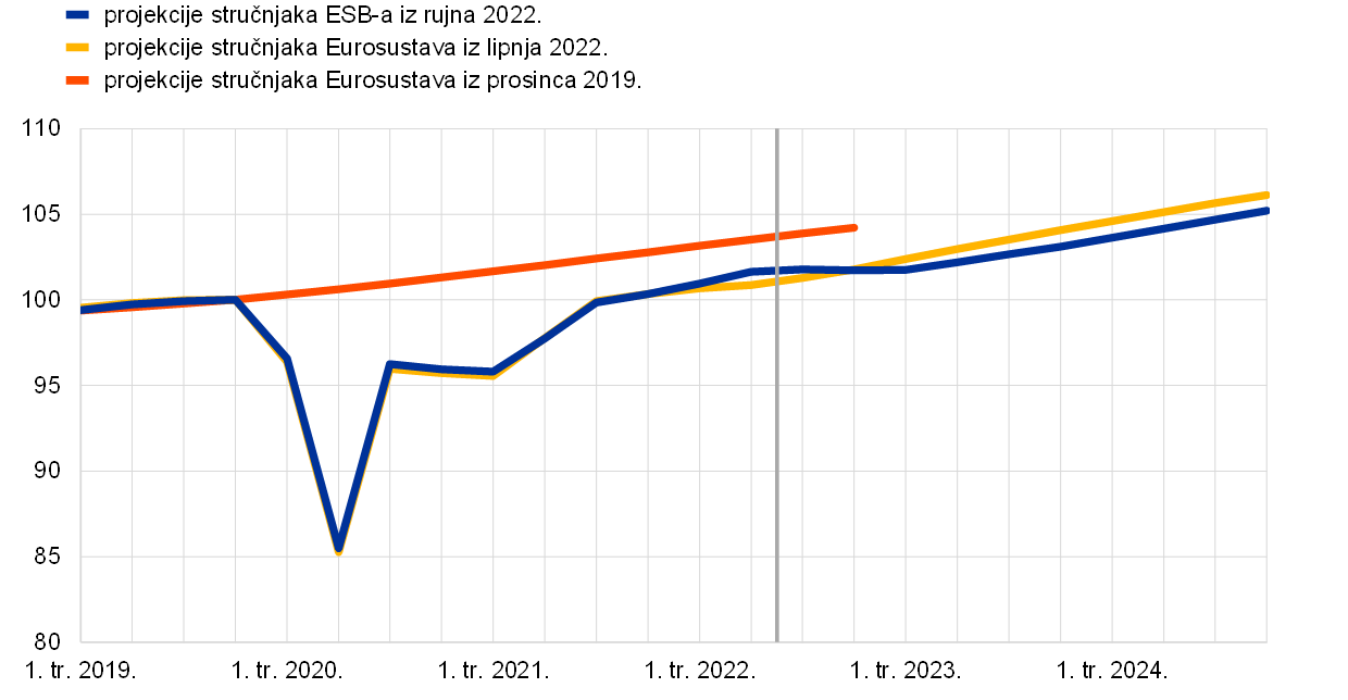 U odnosu na projekcije iz lipnja 2022. rast realnog BDP‑a revidiran je naviše za 0,3 postotna boda za 2022., ali naniže za 1,2 postotna boda za 2023. i 0,2 postotna boda za 2024. Revizija naviše za 2022. posljedica je zamaha rasta koji je u prvoj polovici godine bio jači od očekivanog, a u drugoj je polovici godine djelomično neutraliziran revizijom rasta naniže, koja proizlazi iz povećane neizvjesnosti, slabijeg pouzdanja, više inflacije zbog koje se smanjuju realni dohodci i poremećaja u opskrbi plinom zbog rata u Ukrajini. Tim čimbenicima može se objasniti i prilično velika revizija naniže rasta u prvom tromjesečju 2023. Predviđa se da će se tromjesečni rast BDP‑a početi oporavljati od drugog tromjesečja 2023., iako sporijim tempom nego što se očekivalo u projekcijama iz lipnja. Blaga revizija naniže za 2024. posljedica je postojanosti šokova zbog kojih je došlo do revizija naniže za prethodnu godinu i koji sprječavaju brži oporavak gospodarske aktivnosti.